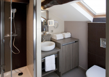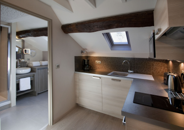 - Au 1er niveau : un salon-chambre, une salle de douches – wc, une cuisine équipée